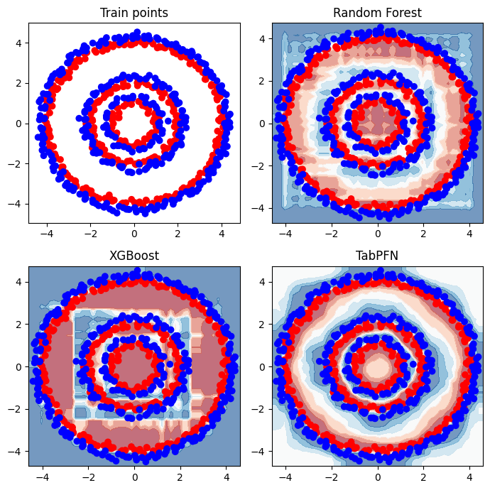 TabPFN’s smoother radial probability surface reflects a different inductive bias: the boundary comes from a pretrained model conditioning on the current rows as context rather than from task-specific tree partitions learned only from this dataset.